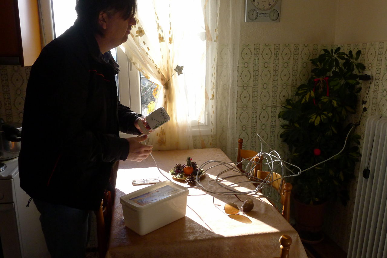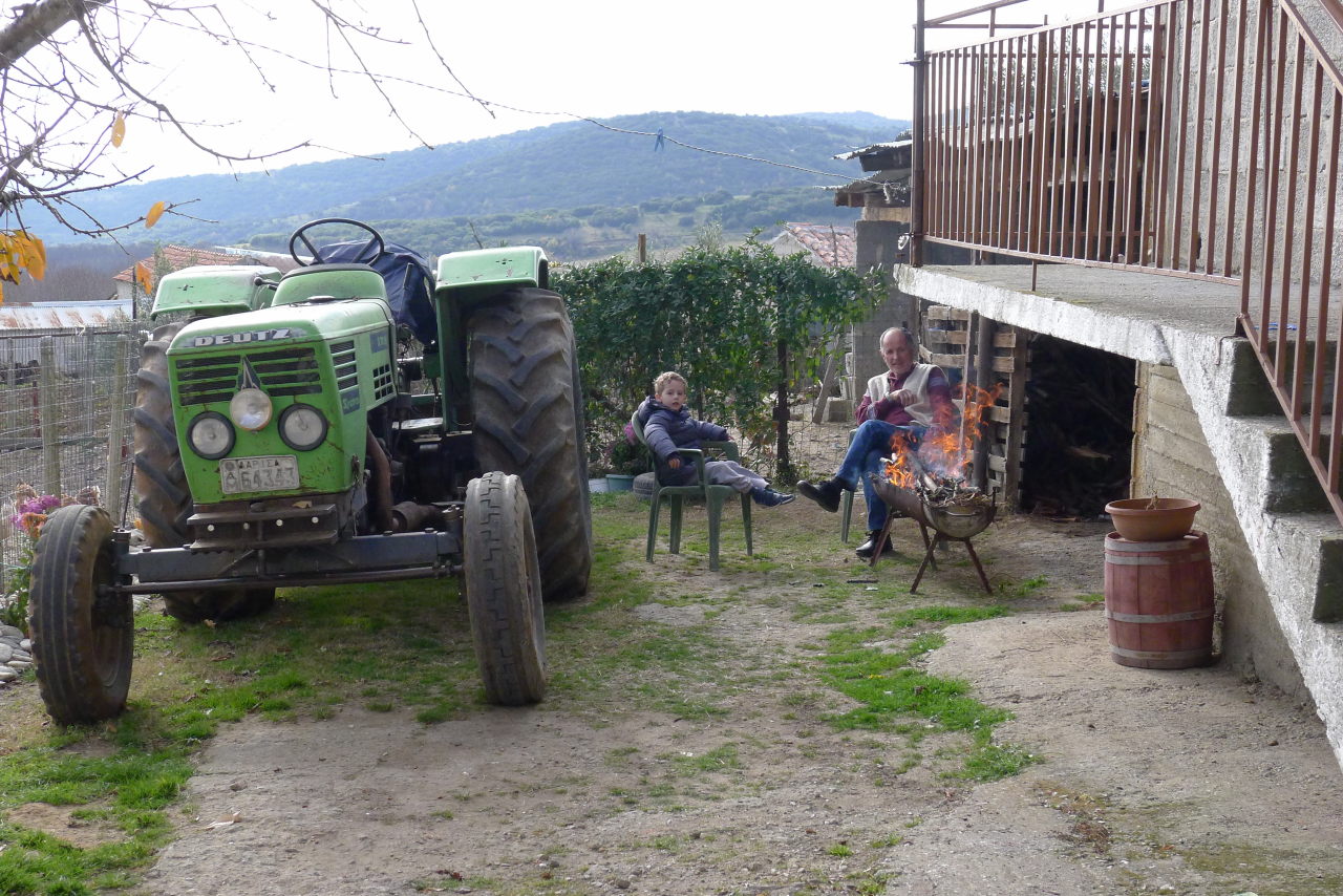Achilleas arrived soon from Larissa where he works as a regional planner, together with his wife and children, and a trunk full of toys ... and cables :-) Our small guided tour would be an opportunity to visit the grandparents. So, our first stop was at the village Farmaki. While his mother in law was preparing our breakfast, and his son was helping his grandfather with the barbeque, Achilleas was repairing an openmesh router before hitting the road.