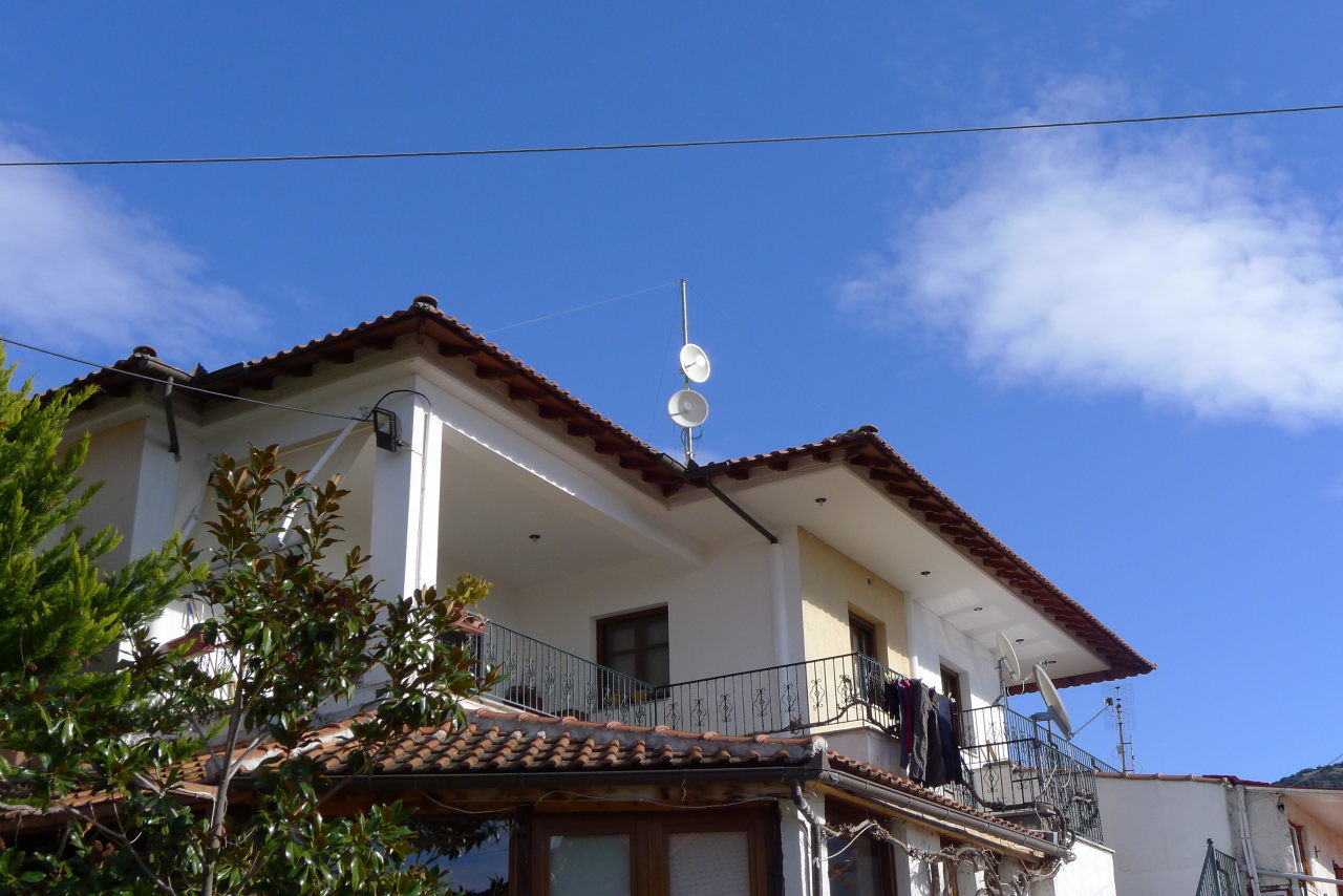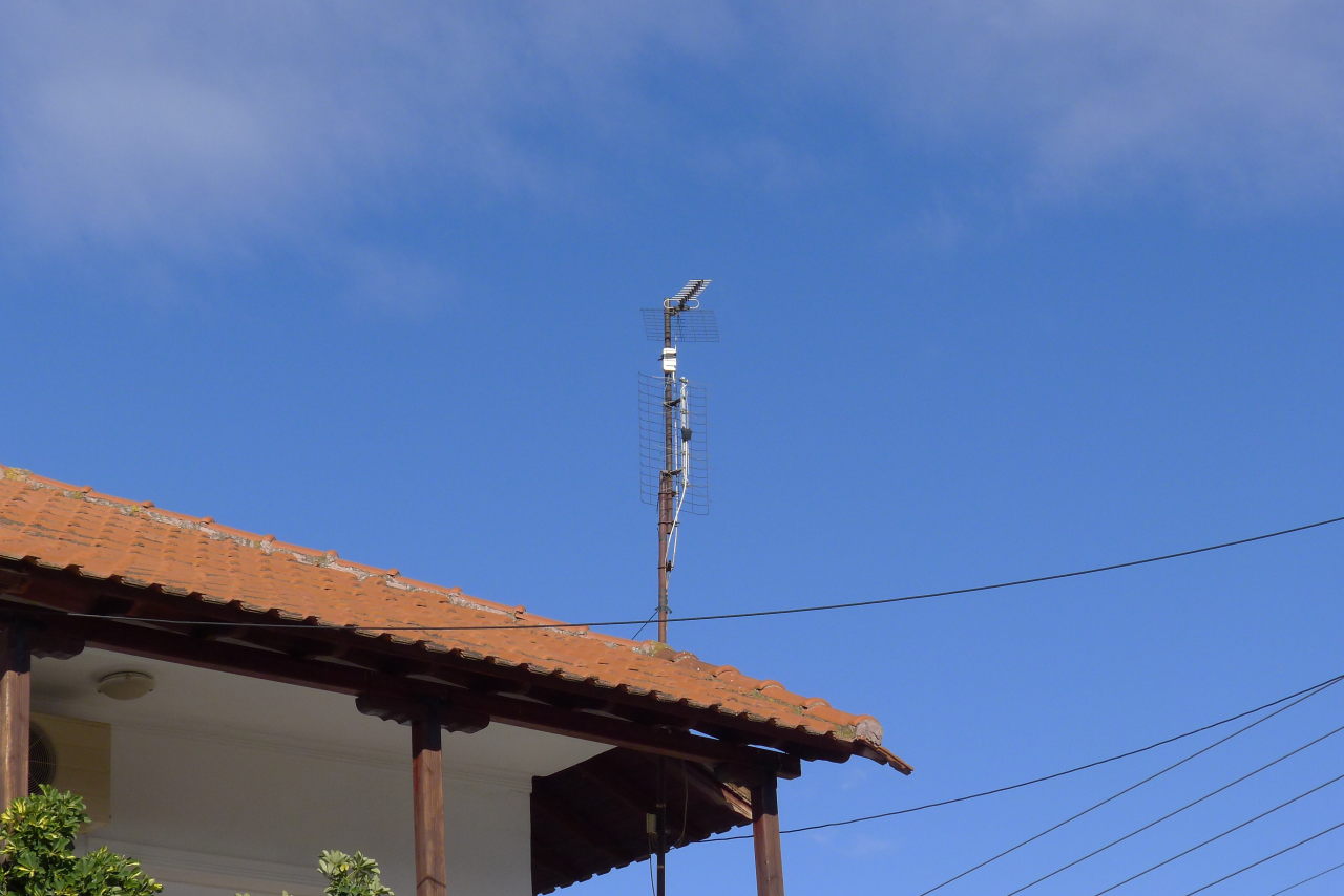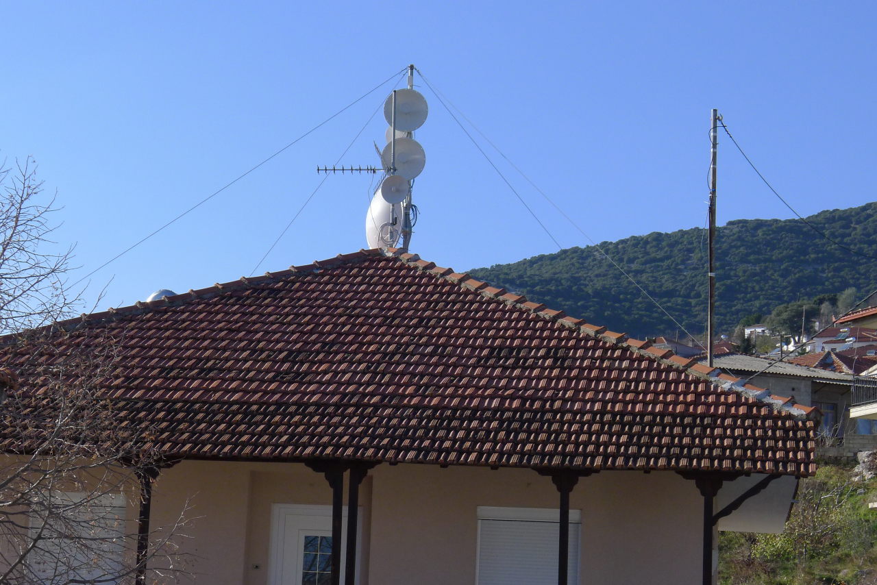 Achilleas explained how the Internet connectivity is provided by the University of Applied Sciences (TEI) of Thessaly in Larissa, which kindly offers a 1GBps link to be shared among all connected villages. The Internet gateway is reached through a two-hop long distance wireless link connecting the backbone network node in Sarantaporo (located at Achilleas' family house) with the TEI of Thessaly through an intermediate node at Melouna village, which offers a convenient hill with line of sight toward both end points whose overall distance is over 50km. Additional long distance links connect the different villages between them, and eventually to the Internet gateway in Larissa. For establishing such "backbone" links one needs specialized antennas, which look like satellite dishes, and which can produce a very "thin" signal toward a specific direction allowing them to reach as far as the line of sight allows.