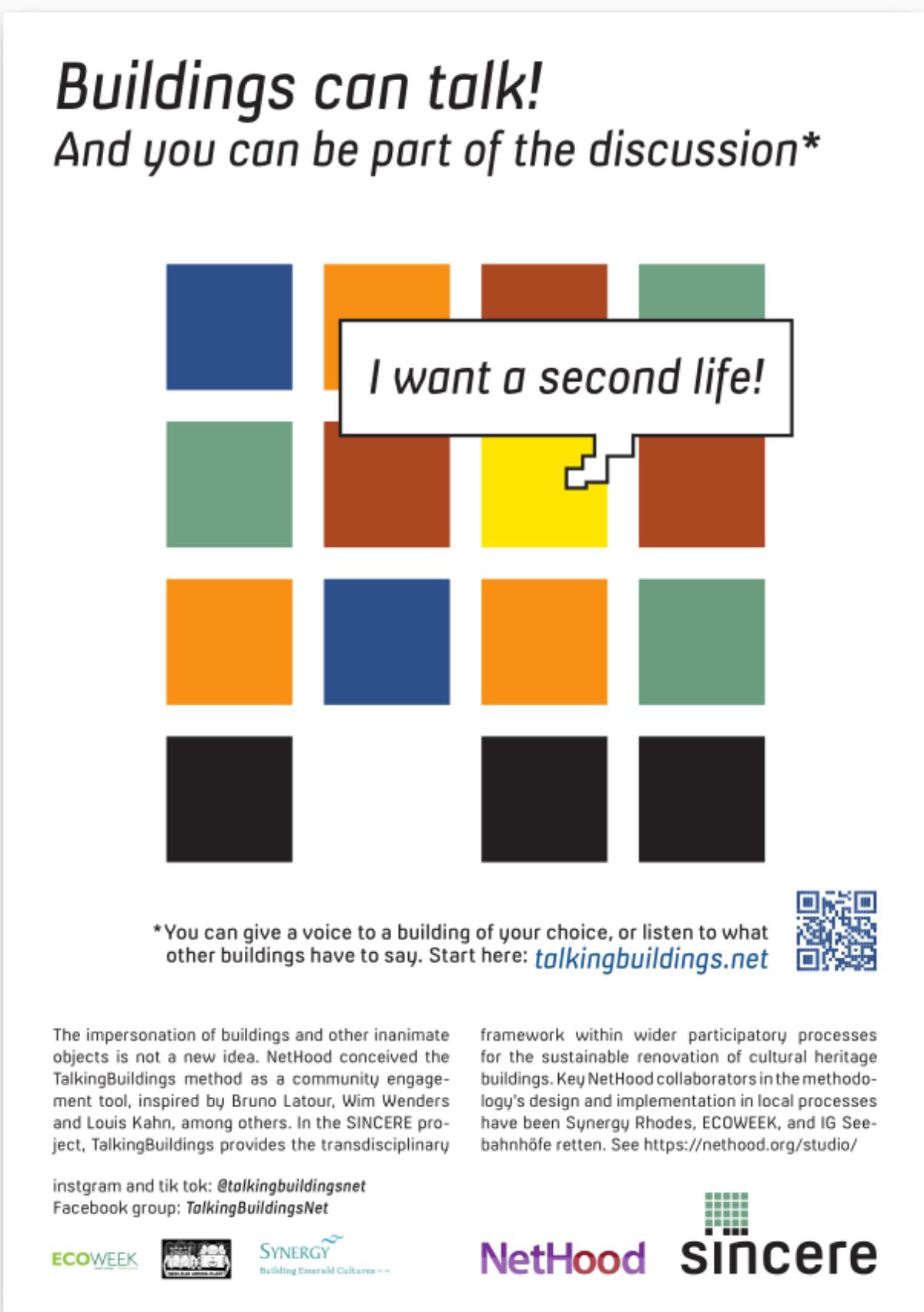 From the poster: The impersonation of buildings and other inanimate objects is not a new idea. NetHood conceived the TalkingBuildings method as a community engagement tool, inspired by Bruno Latour, Wim Wenders and Louis Kahn, among others. In the SINCERE project, TalkingBuildings provides the transdisciplinary framework within wider participatory processes for the sustainable renovation of cultural heritage buildings. Key NetHood collaborators in the methodology’s design and implementation in local processes have been Synergy Rhodes, ECOWEEK, and IG Seebahnhöfe retten. |